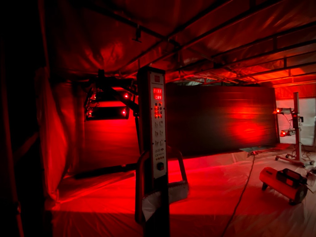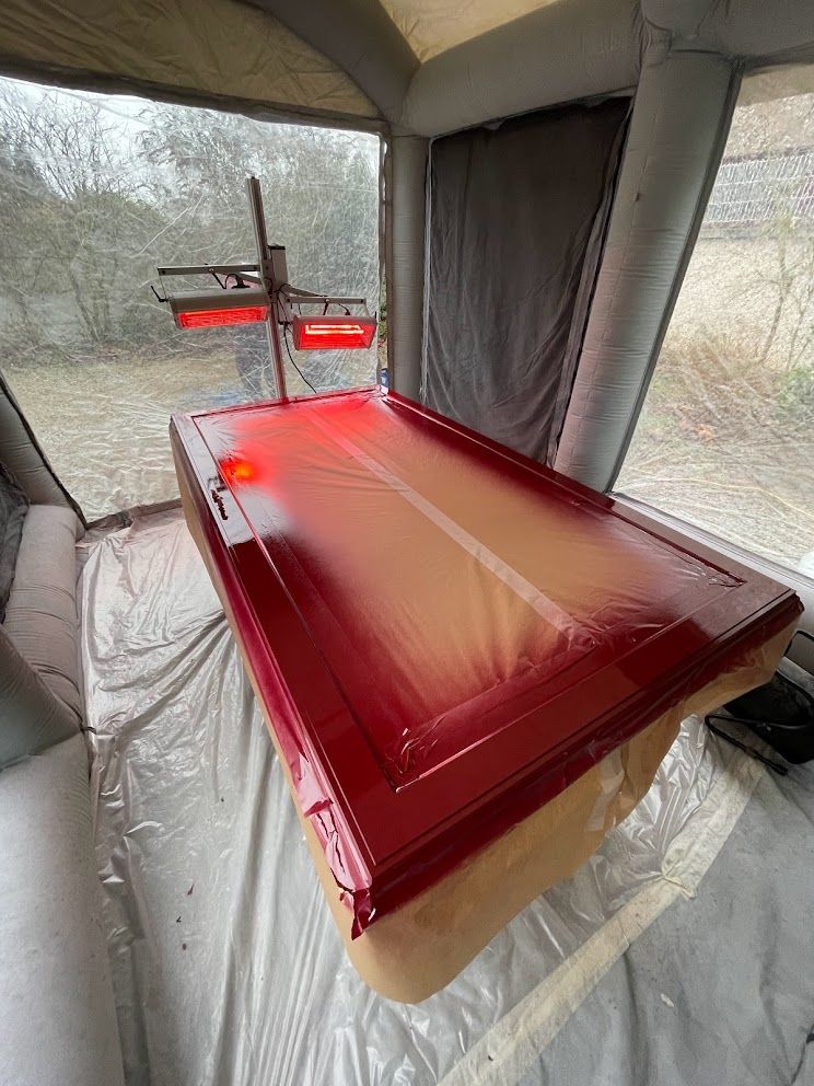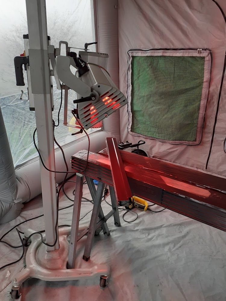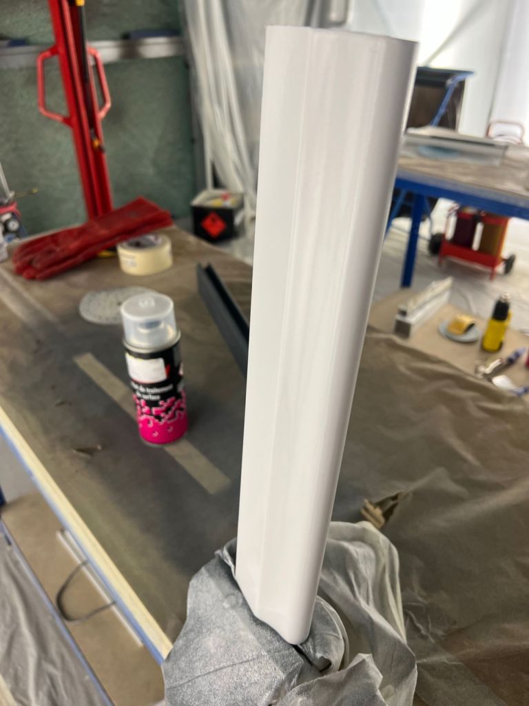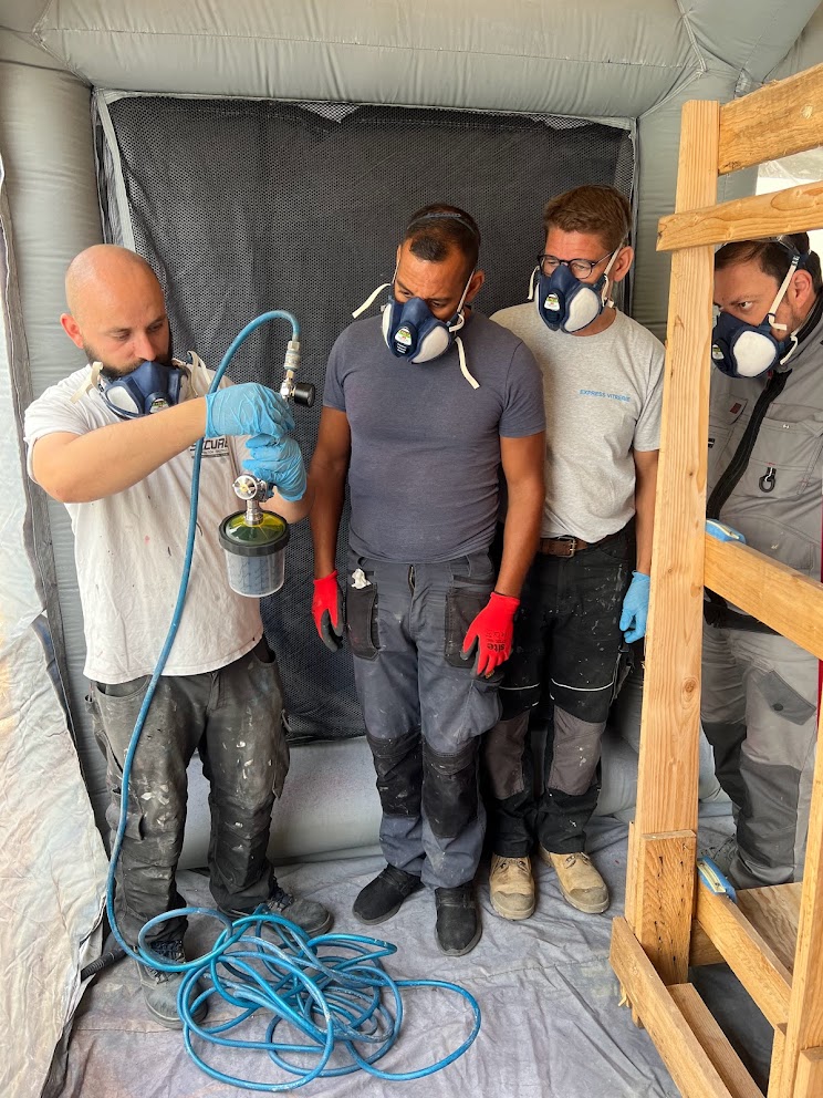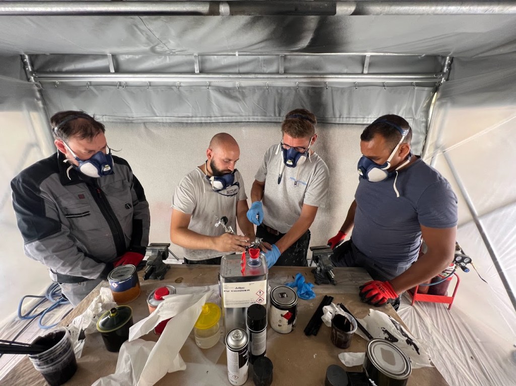 Partie 5 : Raccord des surfaces et finition par application de peinture au pistolet, réalisée soit dans notre cabine de peinture interne, soit dans notre cabine extérieure.